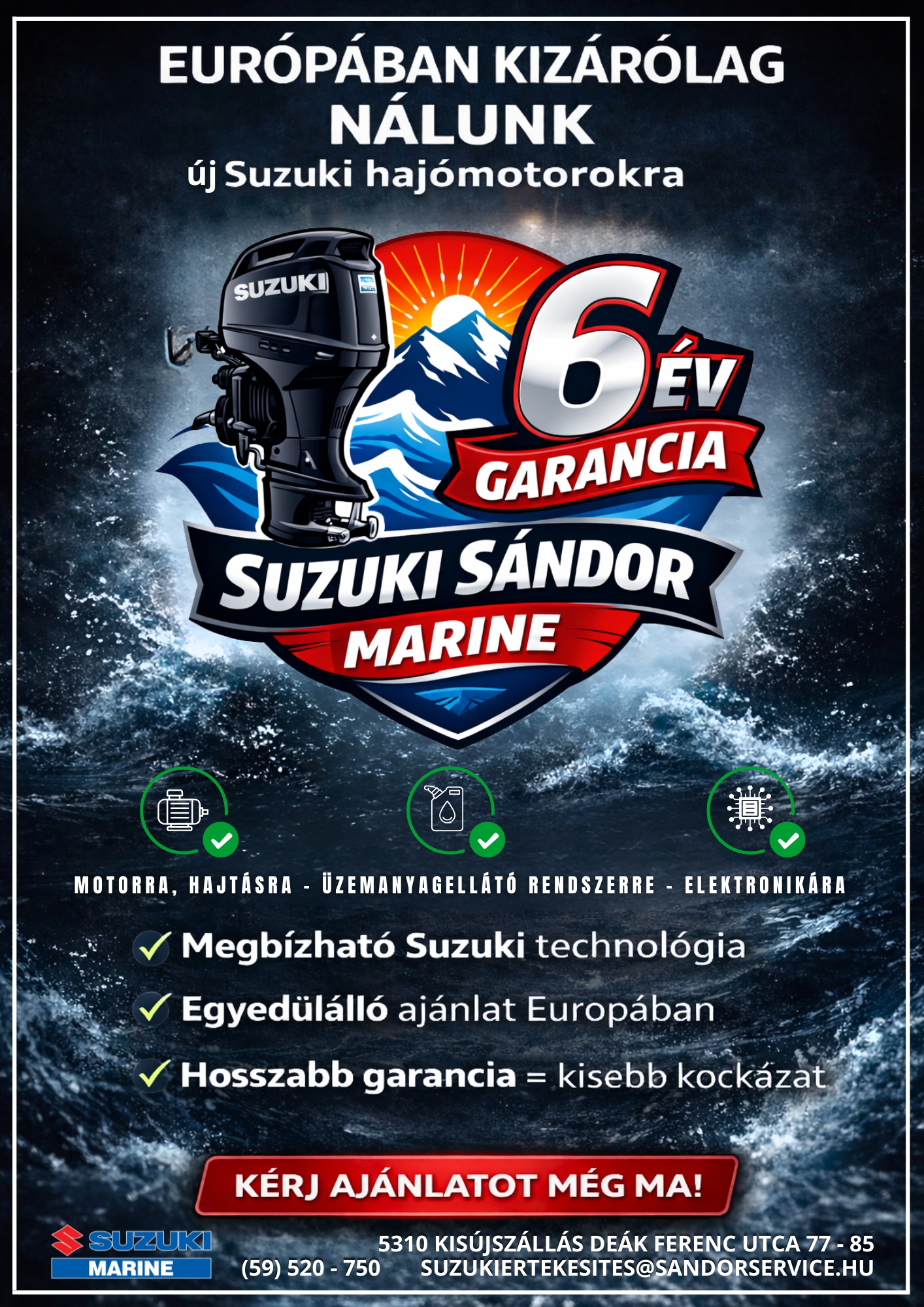 - Kizárólag a Sándor Service Kft-ben ( Suzuki Marine Kisújszállás) vásárolt és üzembe helyezett hajómotorokra érvényes, köthető!